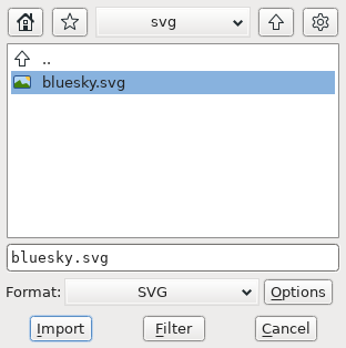 Fig. 2 FontForge ‘Import’ dialogue. (Click on the image to open it on its own).Now, find the U+1F98B butterfly character in the main FontForge window (shown in Fig. 1).1 This can be done via ‘View’ → ‘Goto’ (Ctrl+Shift+>) which accepts the U+NNNN notation. Once found, double-click the box corresponding to the character to open the glyph editing window. In that window, import the prepared SVG icon with ‘File’ → ‘Import’ (Ctrl+Shift+I) dialogue. Make sure you change ‘Format’ to ‘SVG’, as shown in Fig. 2, or the import will fail. With the image imported, only a few minor adjustments are necessary.
